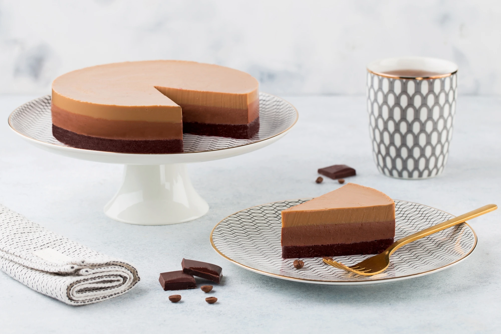 - Chocolate mousse cake, dengan cita rasa cokelat yang pekat dan mewah.
