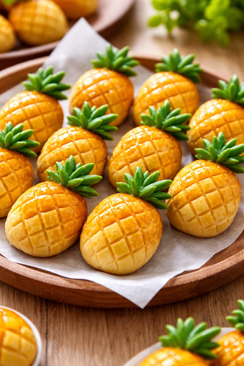 Bentuk ini meniru wujud buah nanas lengkap dengan tekstur kulit dan mahkota daun di bagian atas. Memang butuh sedikit usaha ekstra, tapi hasilnya sepadan. Nastar nanas selalu berhasil mencuri perhatian karena tampilannya yang lucu dan tematik.