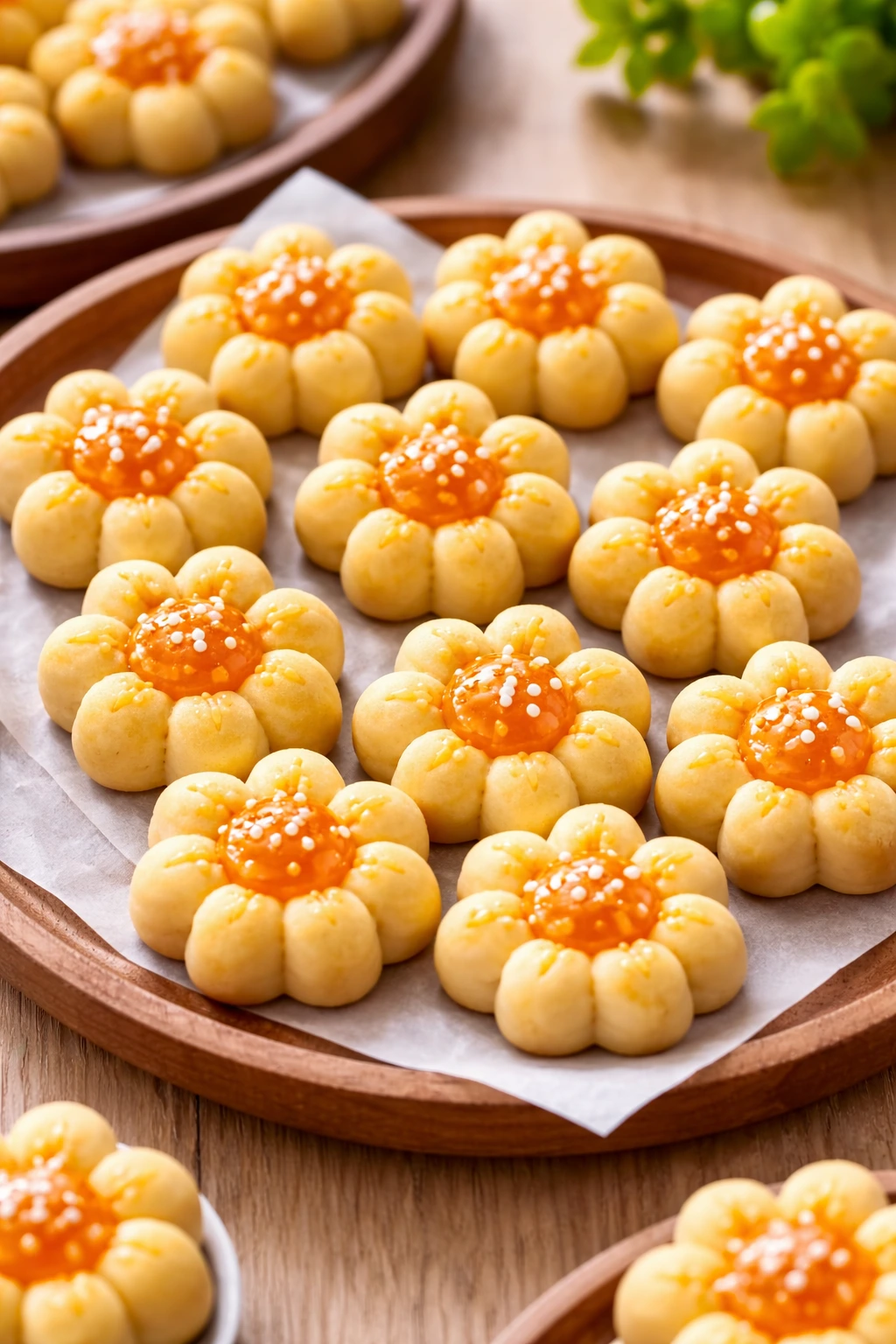 Nastar bunga punya tampilan yang manis dan feminin. Biasanya dibentuk menggunakan cetakan khusus atau teknik manual dengan gunting. Cocok dijadikan suguhan atau hadiah karena tampilannya yang cantik dan beda dari nastar biasa.